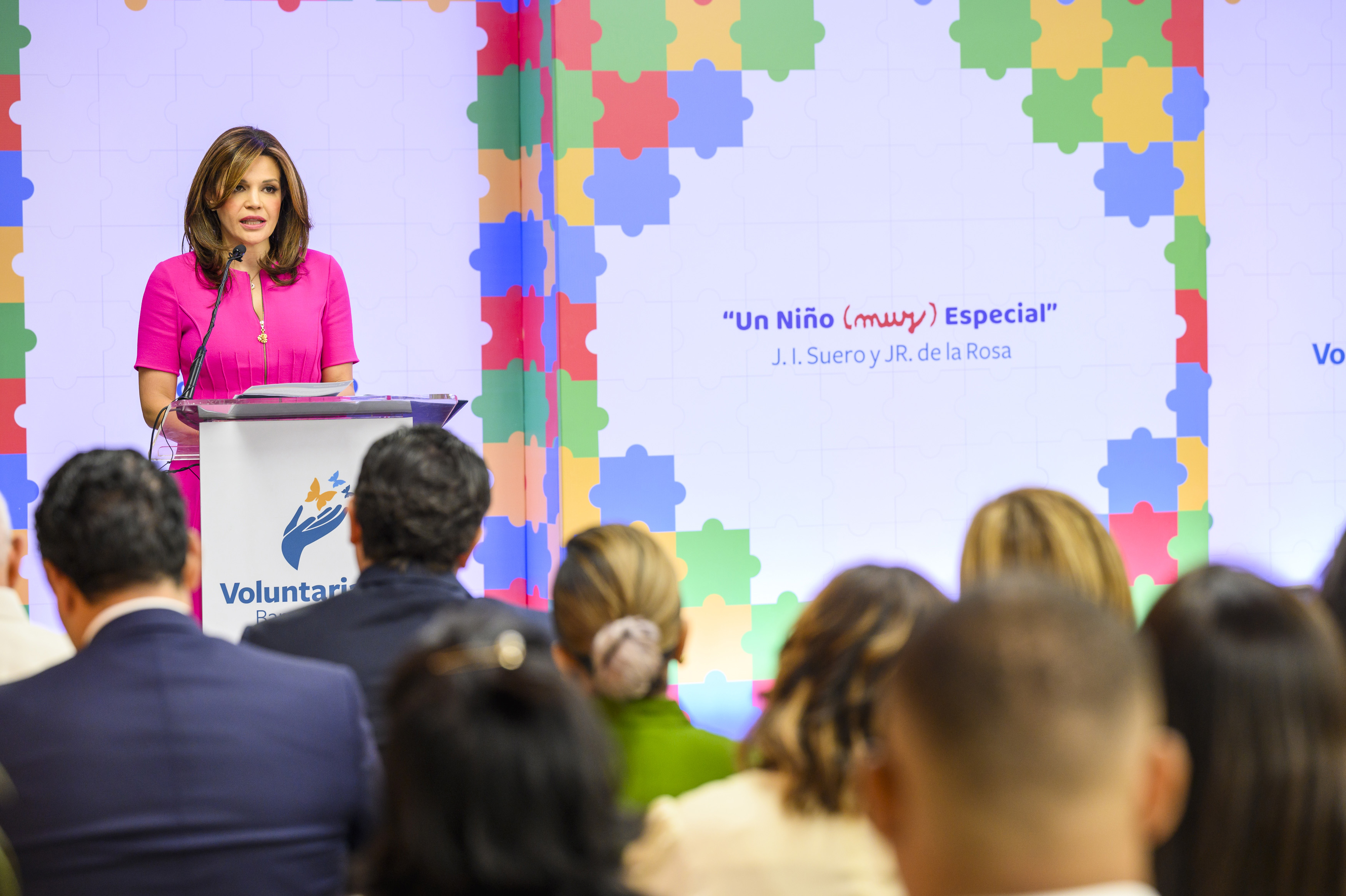 Noelia García de Pereyra, presidenta del Voluntariado, encabezó el acto que se realizó en el Club Banreservas, con motivo del Mes de la Concienciación Mundial Sobre el Autismo, con la presencia de Samuel Pereyra, administrador general de Banreservas.