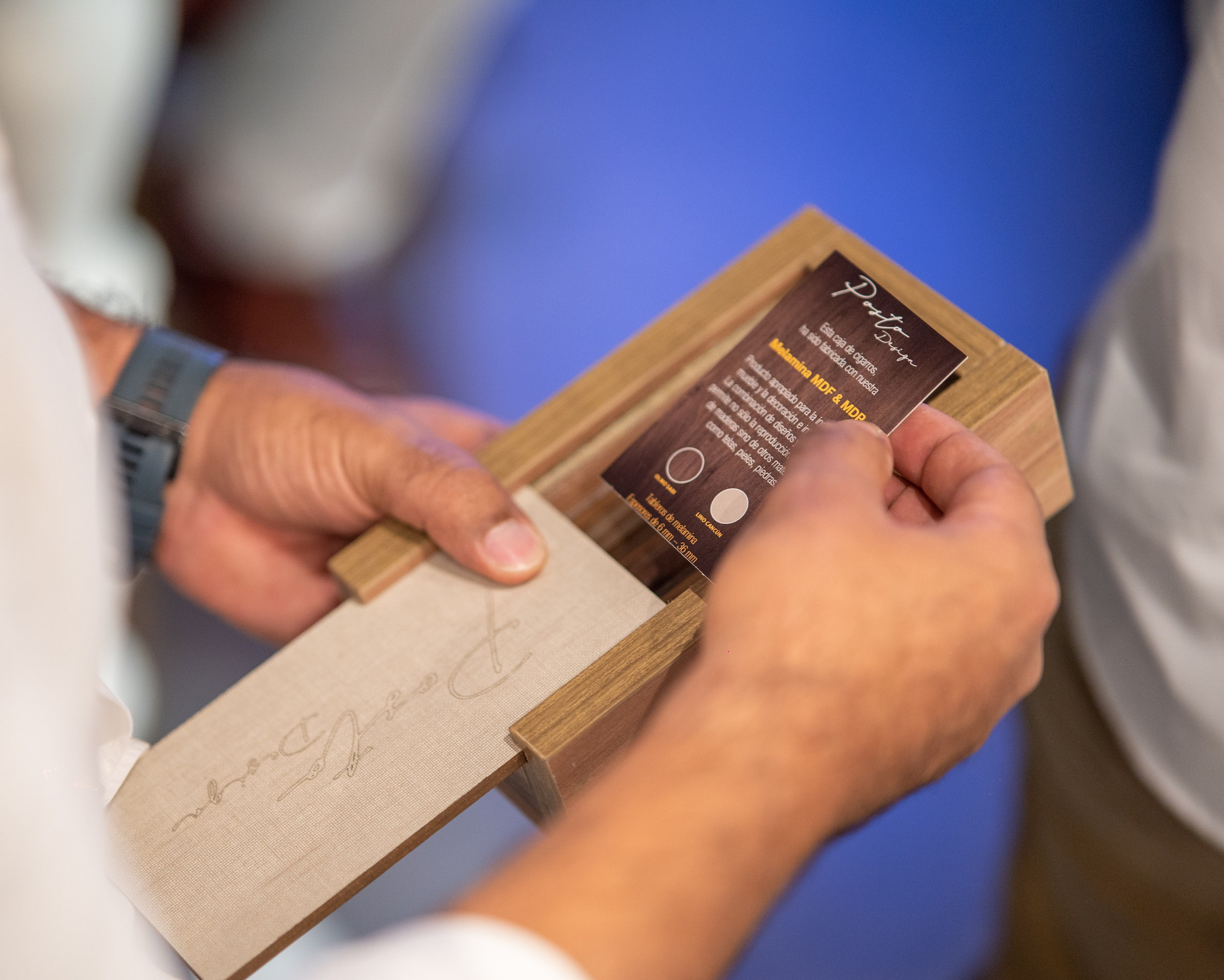En un ambiente de camaradería y complicidad, los presentes disfrutaron del encuentro, en el que, además, recibieron una delicada caja de cigarros, confeccionada con melamina MDF y MDP de Posto Design, un producto apropiado para la industria del mueble, la decoración e interiorismo. Esta evidencia una combinación de diseños y acabados que permite, no solo la creación de chapas de madera, sino de otros materiales como telas, pieles y piedras